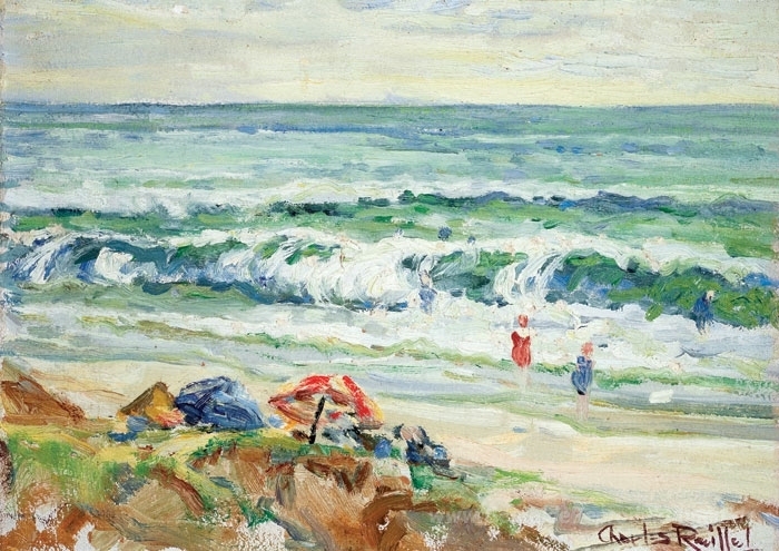 Wir bieten Ihnen eine handgefertigte Reproduktion auf Leinwand des berühmten Kunstwerks 'Strand in Del Mar' von Charles Reiffel, aus dem Reproduktionsmuseum.