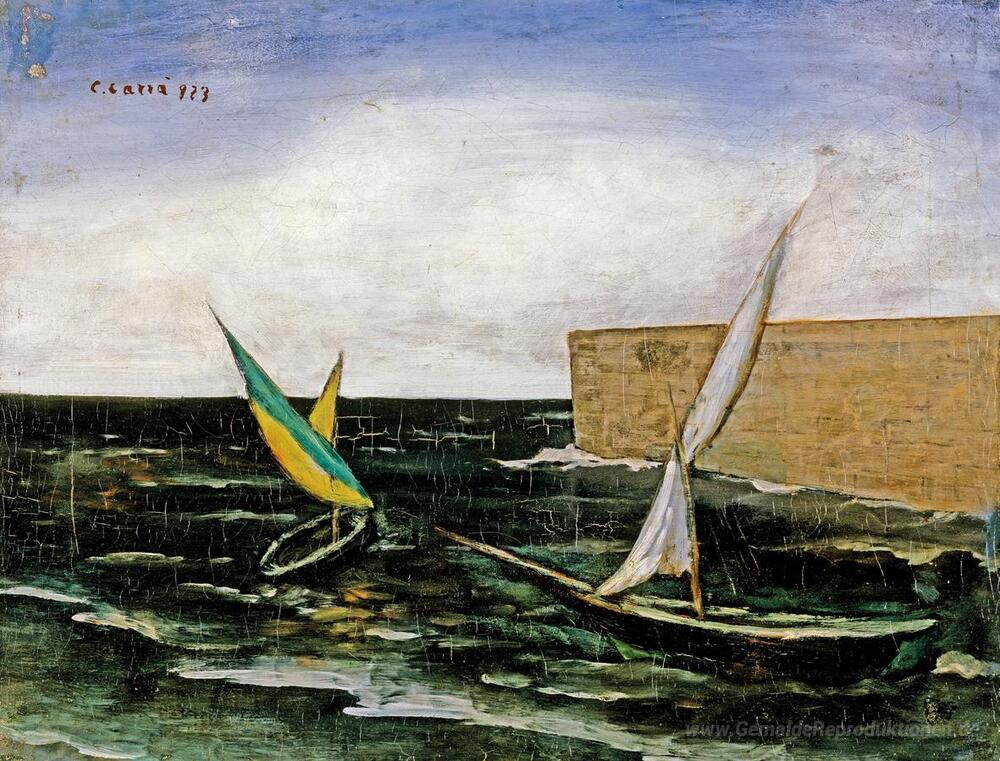 Wir bieten Ihnen eine handgefertigte Reproduktion auf Leinwand des berühmten Kunstwerks 'Vele nel porto' von Carlo Carra, aus dem Reproduktionsmuseum.