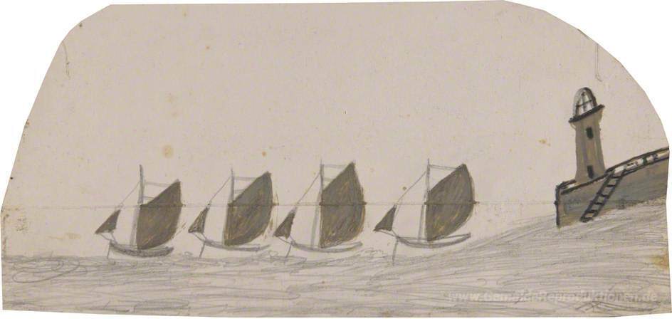 Wir bieten Ihnen eine handgefertigte Reproduktion auf Leinwand des berühmten Kunstwerks 'Vier Segelboote verlassen Pier mit Leuchtturm' von Alfred Wallis, aus dem Reproduktionsmuseum.