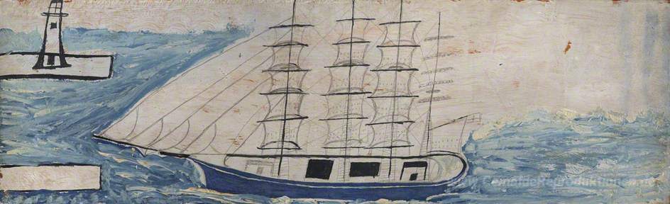 Wir bieten Ihnen eine handgefertigte Reproduktion auf Leinwand des berühmten Kunstwerks 'Viermastsegelschiff und Leuchtturm' von Alfred Wallis, aus dem Reproduktionsmuseum.