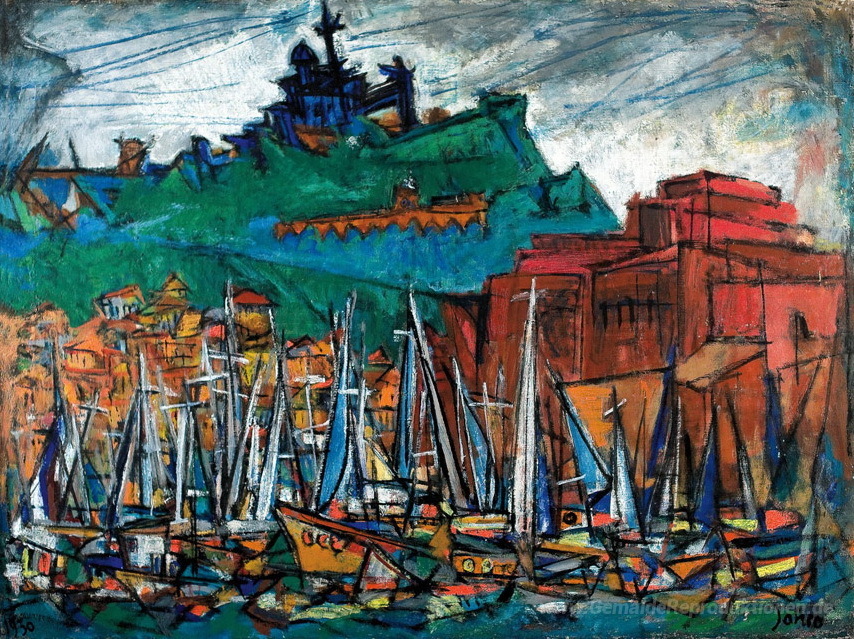 Wir bieten Ihnen eine handgefertigte Reproduktion auf Leinwand des berühmten Kunstwerks 'Yachthafen' von Marcel Janco, aus dem Reproduktionsmuseum.