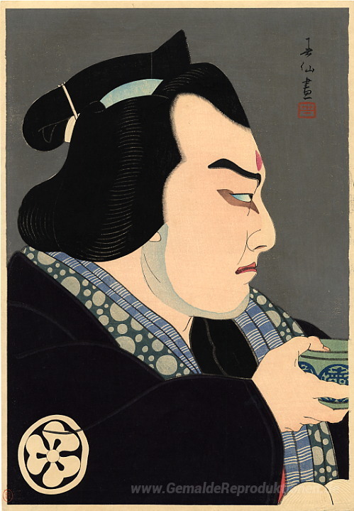 Wir bieten Ihnen eine handgefertigte Reproduktion auf Leinwand des berühmten Kunstwerks 'Bando Jusaburo in der Rolle Seigoro' von Natori Shunsen, aus dem Reproduktionsmuseum.