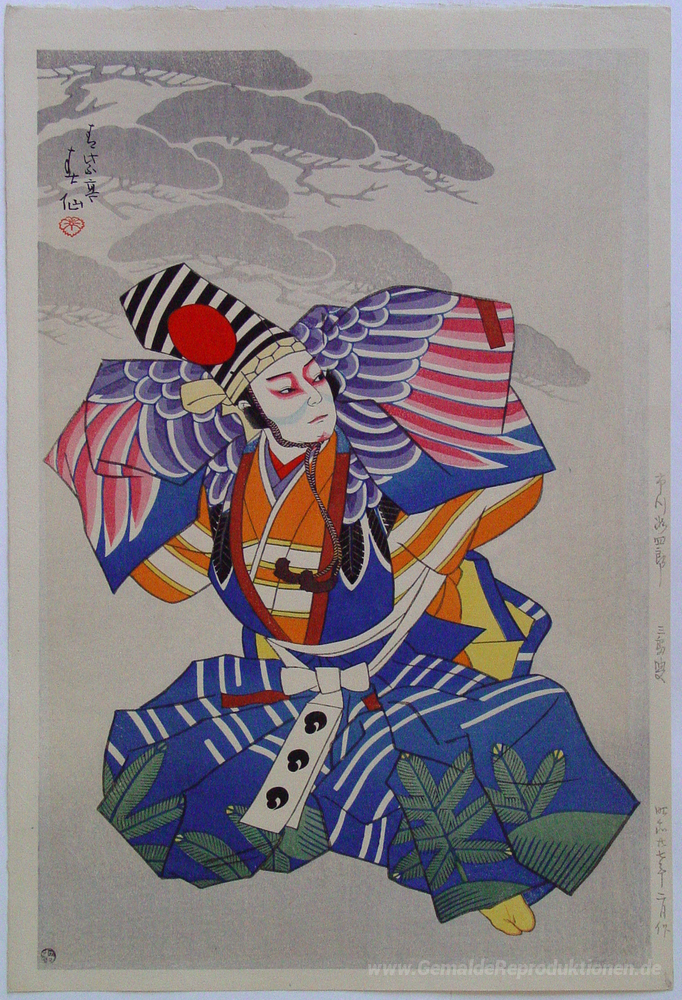 Wir bieten Ihnen eine handgefertigte Reproduktion auf Leinwand des berühmten Kunstwerks 'Ichikawa Danshiro als Sanbasô Tänzerin in blauen Kimono' von Natori Shunsen, aus dem Reproduktionsmuseum.