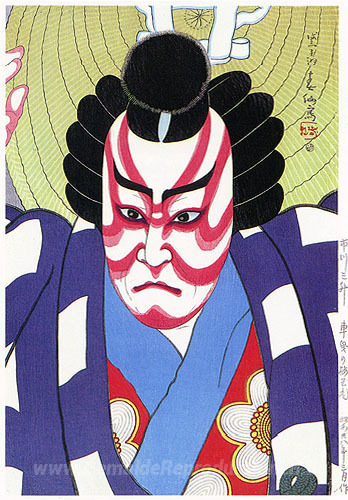 Wir bieten Ihnen eine handgefertigte Reproduktion auf Leinwand des berühmten Kunstwerks 'Ichikawa Sansho als Umeo in Kurumabiki' von Natori Shunsen, aus dem Reproduktionsmuseum.