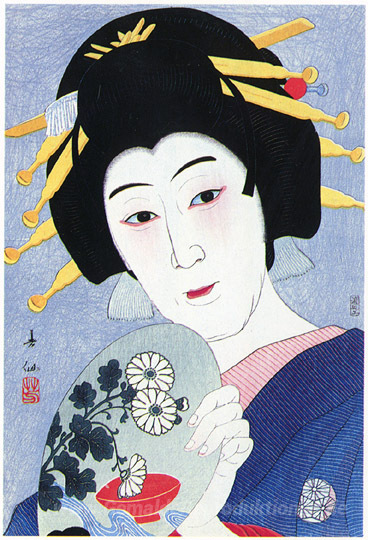 Wir bieten Ihnen eine handgefertigte Reproduktion auf Leinwand des berühmten Kunstwerks 'Onoe Baiko als Aburaya Okon' von Natori Shunsen, aus dem Reproduktionsmuseum.