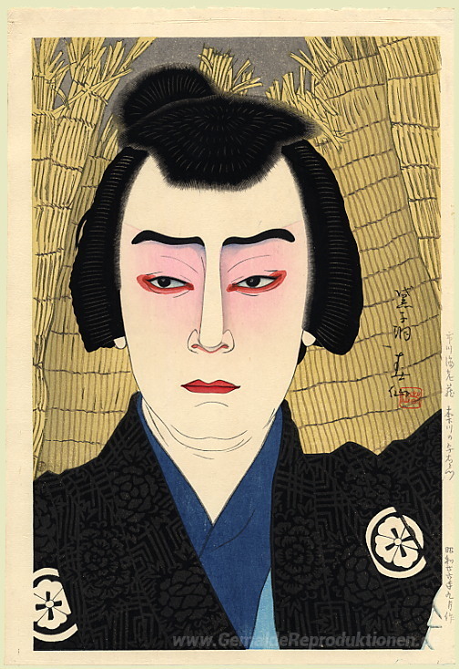 Wir bieten Ihnen eine handgefertigte Reproduktion auf Leinwand des berühmten Kunstwerks 'Sawamura Sojoro als Narihira Reizo' von Natori Shunsen, aus dem Reproduktionsmuseum.