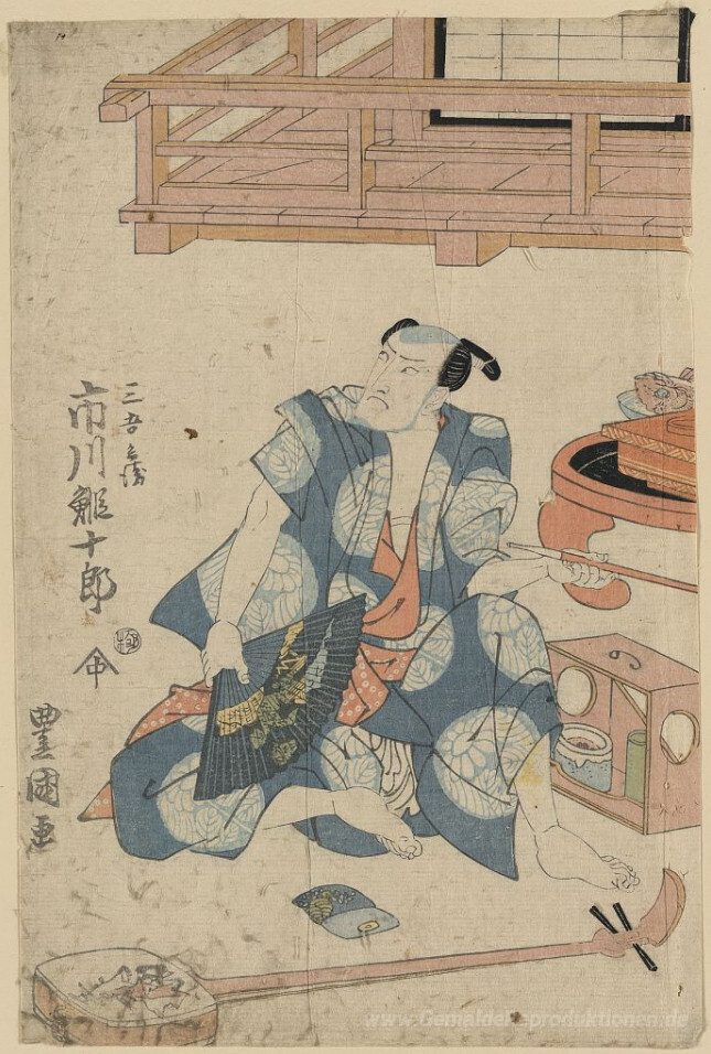Wir bieten Ihnen eine handgefertigte Reproduktion auf Leinwand des berühmten Kunstwerks 'Schauspieler Ichikawa Ebijuro, auf dem Boden sitzend mit Shamise' von Utagawa Toyokuni, aus dem Reproduktionsmuseum.