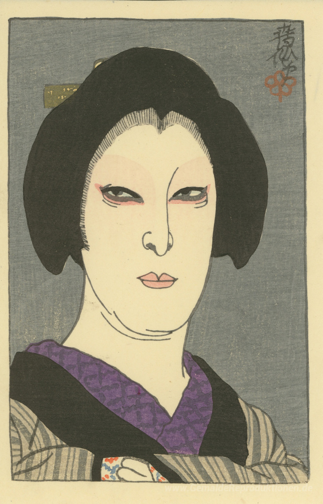 Wir bieten Ihnen eine handgefertigte Reproduktion auf Leinwand des berühmten Kunstwerks 'Taminosuke in der Rolle Otsuma' von Natori Shunsen, aus dem Reproduktionsmuseum.