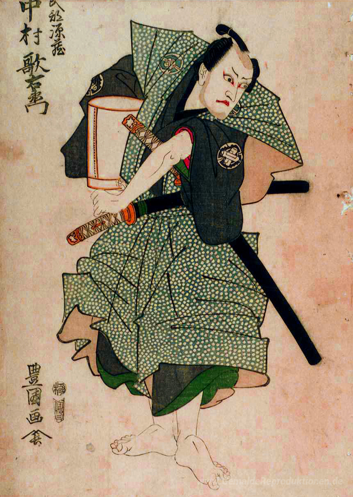 Die Verwendung von lebendigen Farben und detaillierten Darstellungen verleiht diesem Gemälde eine besondere Tiefe und Dynamik, die jeden Betrachter in ihren Bann zieht. Dank seiner künstlerischen Fertigkeiten hat Utagawa Toyokuni das Bildnis eines Schauspielers in einem Moment der Anmut und Kraft verewigt. Dieses Kunstwerk ist nicht nur ein optisches Highlight, sondern trägt auch zur harmonischen Atmosphäre Ihres Wohnraums bei und schafft einen eindrucksvollen Gesprächsanlass.