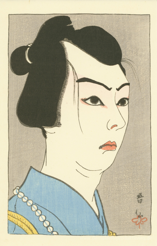Wir bieten Ihnen eine handgefertigte Reproduktion auf Leinwand des berühmten Kunstwerks 'Uzaemon in der Rolle von Shirai Gonpachi' von Natori Shunsen, aus dem Reproduktionsmuseum.