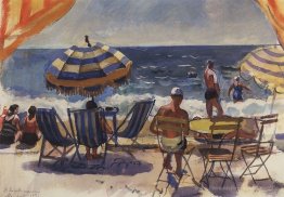 Menton. Strand mit Sonnenschirmen